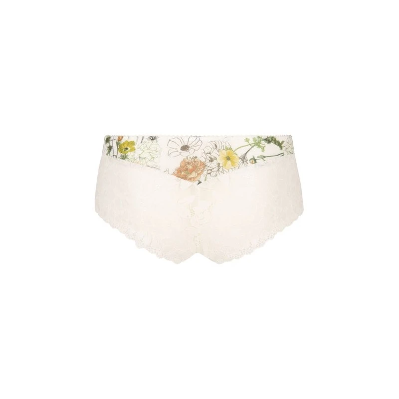 Shorty en maille imprimée avec cotés devant et dos en dentelle. Un élastique festonné souligne la taille