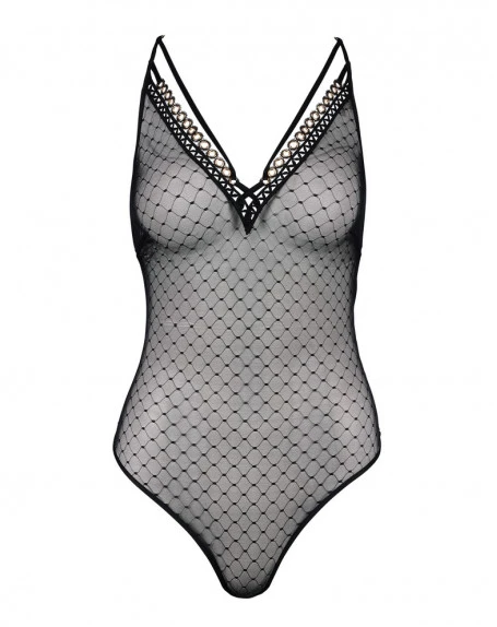 Ce body en tulle fantaisie possède un dos graphique vertigineux aux bandes bondage. Son décolleté plongeant ajoute un effet sexy tout en restant élégant.