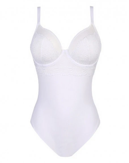 Un irrésistible body avec le charme d’un soutien-gorge bustier. Détail tendance : l’élément décoratif graphique sur l’entre-bonnet. Broderie graphique dans un blanc frais : sexy, estival et idéal pour les futures mariées.
