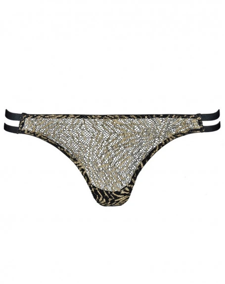 Cet ensemble Aubade contient un soutien-gorge triangle sans armature et un tanga. Cette pièce en taille unique est ajustable. Les bandes graphiques sexy sont orchestrées par un sublime bijou doré.