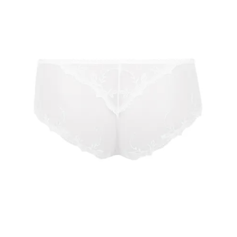Shorty en broderie festonnée devant et dos . Empiècement de guipure et incrustation de galon festonné en milieu dos.