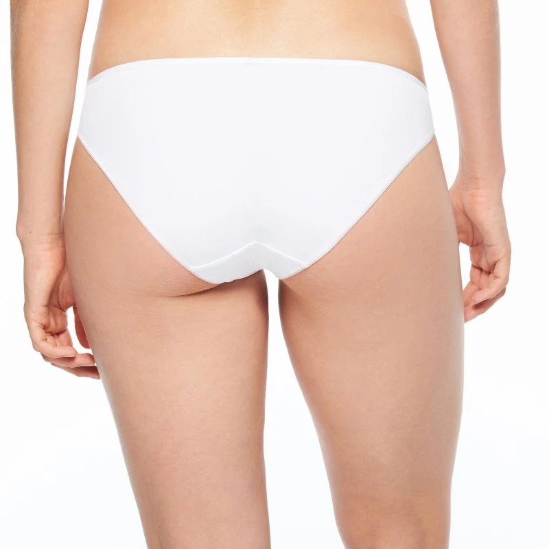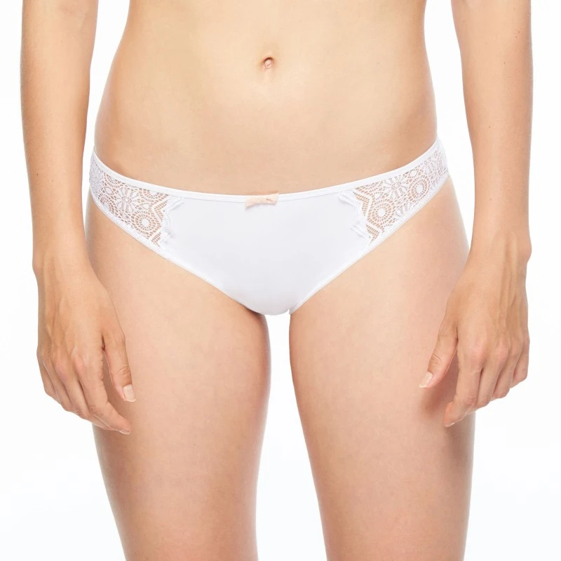 Coupe slip en maille opaque ultra douce avec petit nœud contrasté au centre. Empiècement de dentelle graphique sur les cotés.