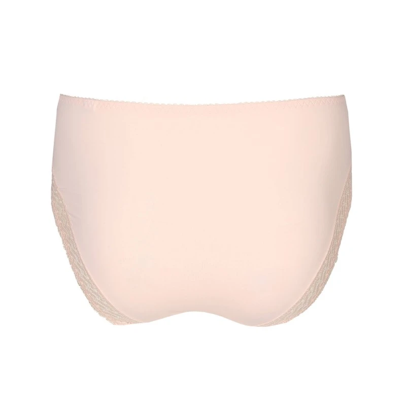 Élégante culotte taille haute en tissu lisse, affichant des bandes de dentelle qui s’étendent de l’avant à l’arrière.