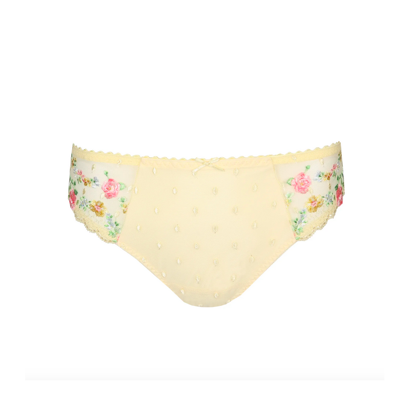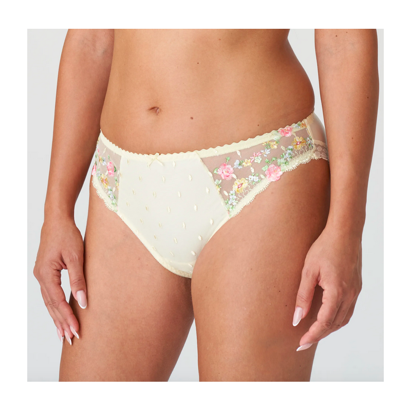 Slip brésilien en tulle à pois affichant de jolies fleurs sur les côtés.