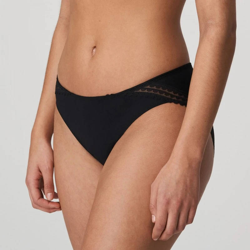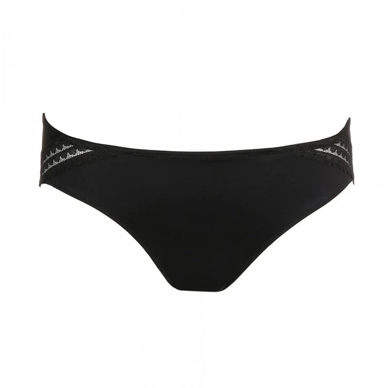Slip brésilien sensuel en maille douce, orné d’un galon de dentelle sur les fesses, avec empiècement de tulle transparent dans le dos.