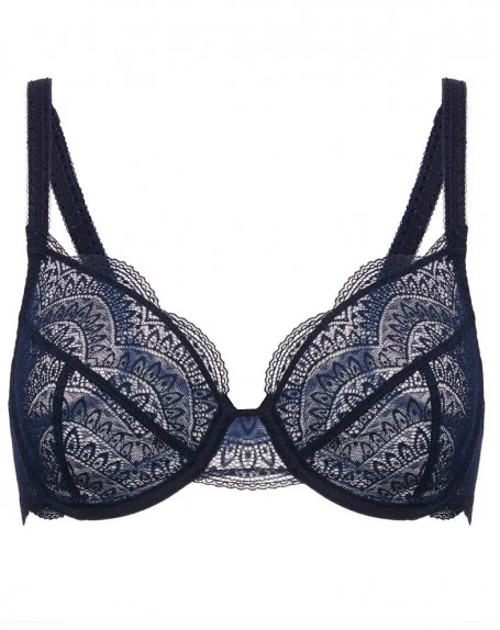 Le soutien-gorge armature Simone Pérèle de la collection Karma offre un confort parfait. Les bretelles sont réglables et se portent croisées dans le dos ou non. Une dentelle moderne et légère.