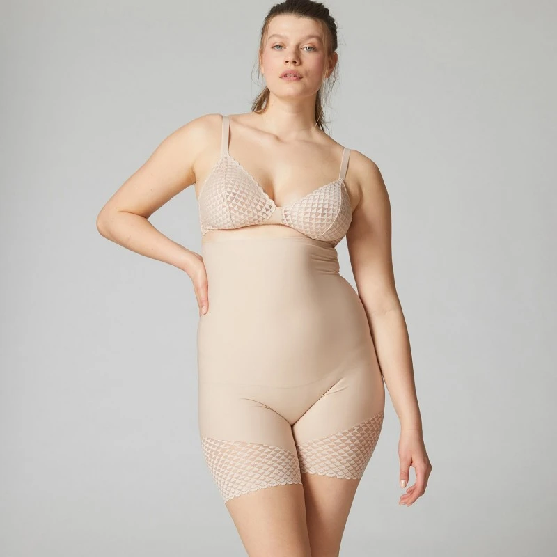 Panty gainant taille haute en dentelle et maille nerveuse.