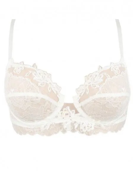 La collection Imagine la Beauté de la marque Lise Charmel est ligne qui met en lumière une féminité romantique et moderne. C’est par des coupes épurées que la délicatesse des graphiques de la dentelle sont mis en lumière tout comme la broderie de fleurs d’Azalées fine et légère. Un style lumineux et féminin séduisant par ses détails comme le strass à l’entre gorge ou les nuances présentes dans son coloris intemporel écru nacre.