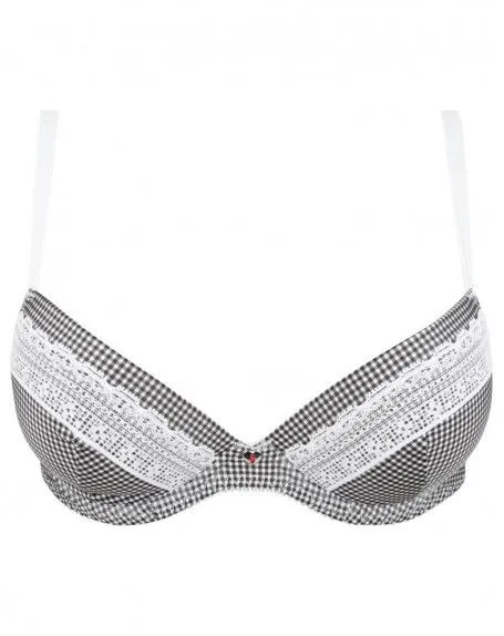 Le soutien-gorge à coques Antigel de la collection Vichy Citadine en coques progressives pour les bonnets A-B et Light pour les bonnets C-D, offre un parfait maintien et une allure jeune et élégante grâce à ses bandes en dentelle au niveau du bonnet qui illuminent le teint, ainsi que le motif Vichy de sa maille douce et brillante.