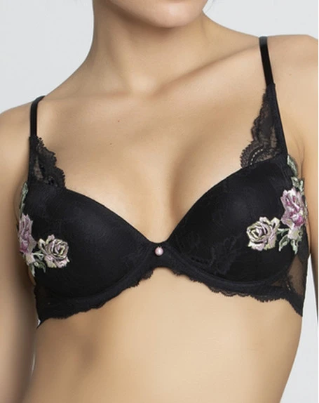 Le soutien-gorge à coques Désir de Roses de la marque Lise Charmel offre un confort associé à une touche de féminité et sensualité par un décolleté raffiné orné de dentelle ajourée alliée à son motif floral original. Ce produit est proposé en coque progressive pour le bonnet A, puis en coque light, plus fine et légère en bonnet supérieurs.
