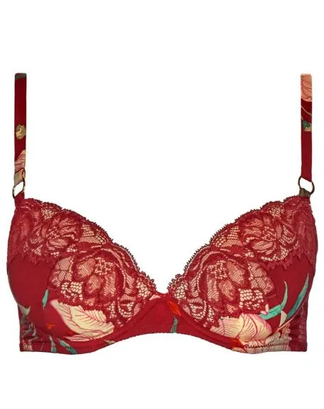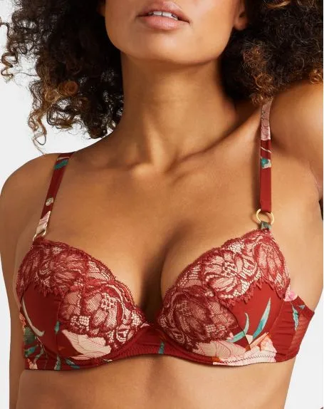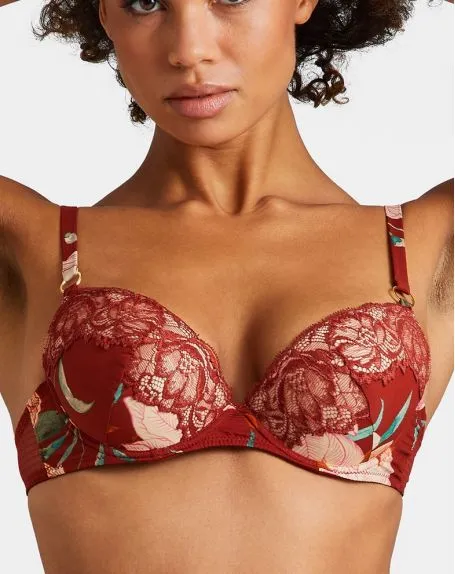 Le soutien-gorge plunge à coques Aubade de la collection Sweet Folk offre un motif floral unique et élégant, avec un décolleté bordé par une jolie dentelle leavers.