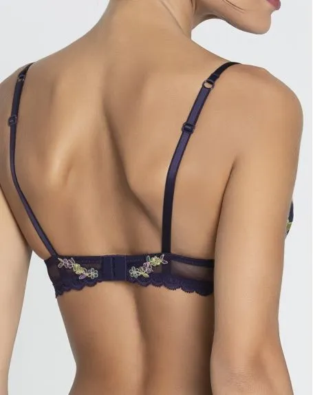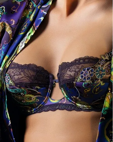 Le soutien-gorge corbeille Lise Charmel de la collection Dentelle Cashmer propose une matière soie imprimé du motif créatif propre à cette gamme, pour une forme échancrée avec un décolleté pigeonnant qui est délicatement enrichi par des motifs de cashmere brodés sur les bretelles.