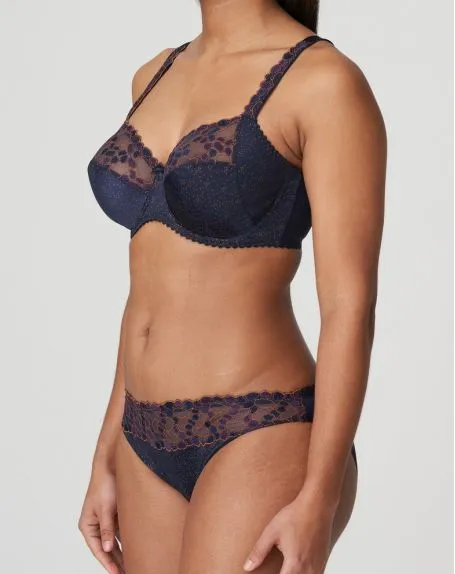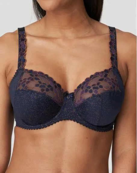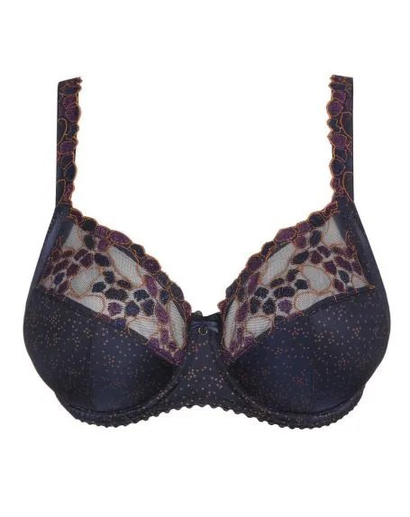 Un élégant soutien-gorge à armatures réalisé dans un tissu imprimé doux et une broderie brillante très raffinée. La broderie sur le haut des bonnets agrémente joliment les bretelles.