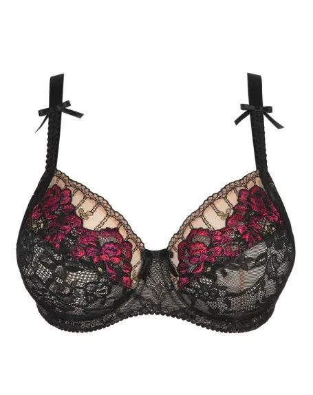 Soutien-gorge à armatures raffiné en dentelle noire, orné de roses rouges chaudes brodées. Confortable et sexy, avec des bonnets supérieurs transparents qui donnent l’illusion d’un décolleté profond. Les bonnets inférieurs sont doublés et, avec la pièce latérale, offrent un soulèvement ferme. Une coupe séduisante qui tombe bien !