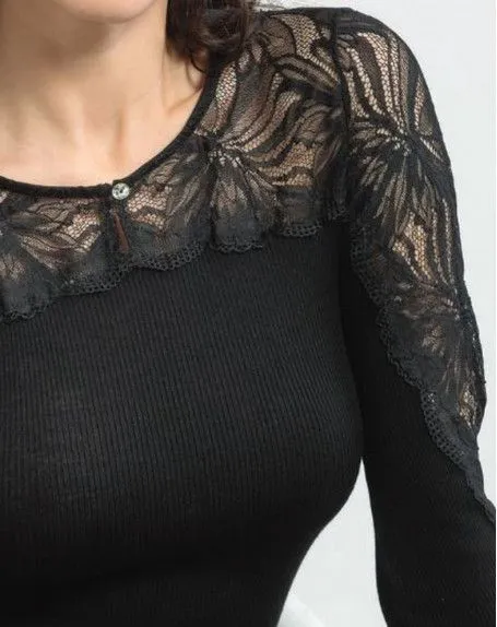 Ce top manches longues dentelle MORETTA en maille plissée, aux finitions sobres et soignées est composé de 85% de laine et de 15% de soie pour un grand confort au porter. Ce top Moretta propose une partie haute original avec un col très élégant.