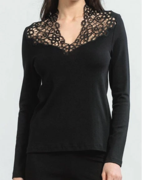 Ce top manches longues MORETTA aux finitions sobres et soignées est composé de 85% de laine et de 15% de soie pour un grand confort au porter. Ce top Manches longues Moretta en noir offre un joli décolleté sublimé par une dentelle travaillée pour un maximum de féminité.